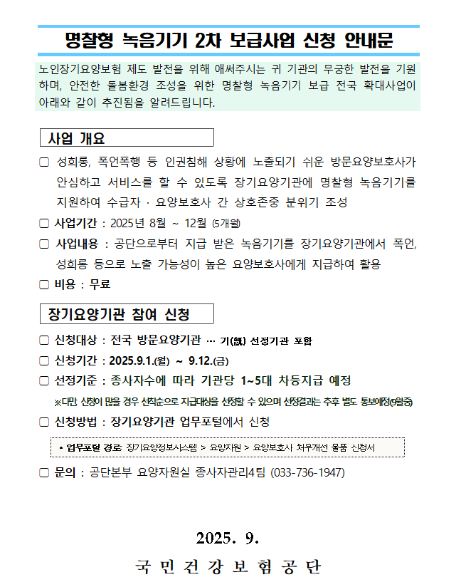 1. 사업개요○ 사 업 명: 방문요양보호사 녹음기기 보급 사업○ 사업기간: 2025.8.~12. (총 5개월) ○ 사업내용: 재가방문요양보호사 안전근무환경 조성 위해 명찰형 녹음기기 무상보급